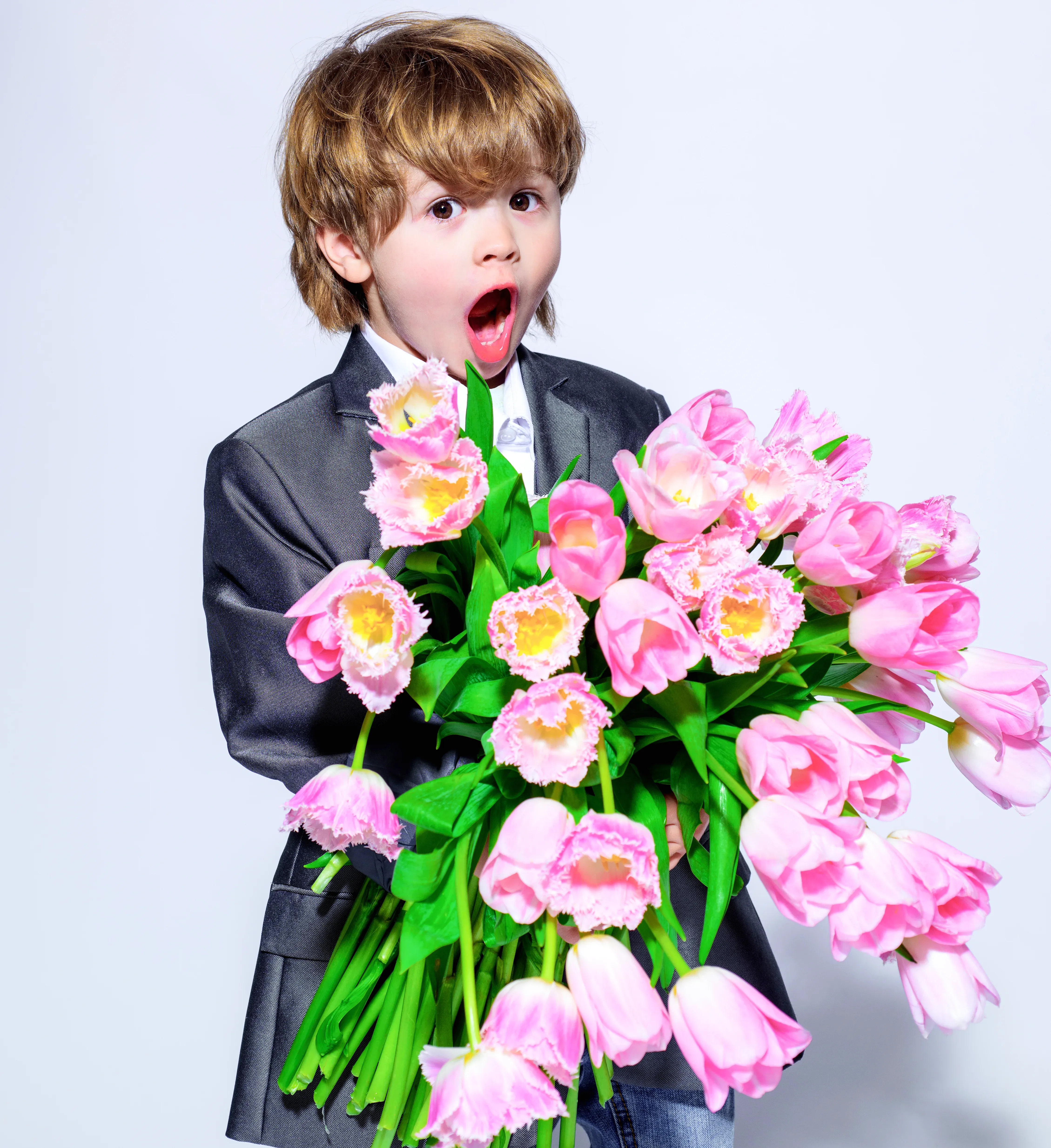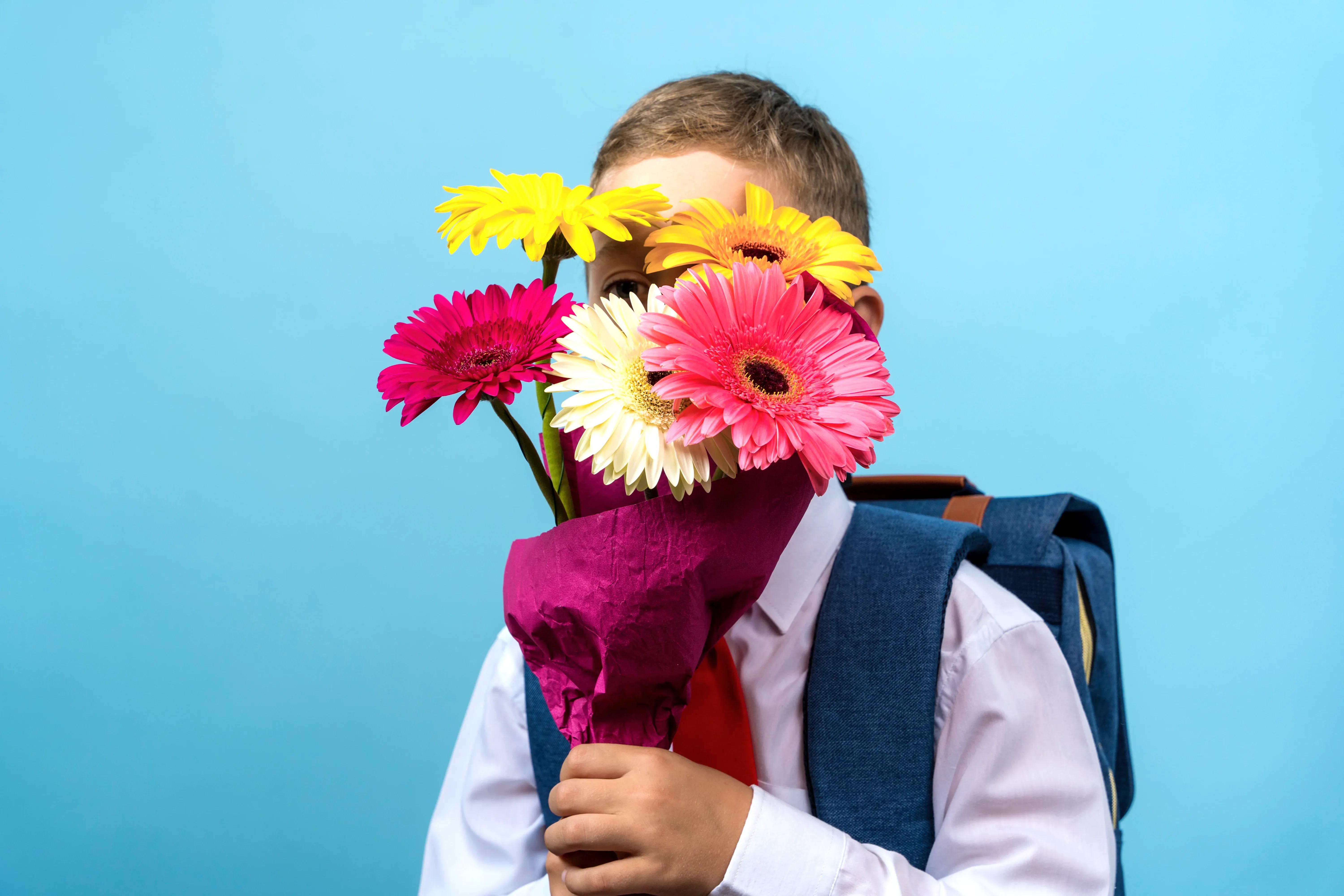- Помимо гербер и ромашек, в сочетании букета на первый звонок могут участвовать гвоздики, тюльпаны, хризантемы, гладиолусы, пионы ну и розы конечно же.