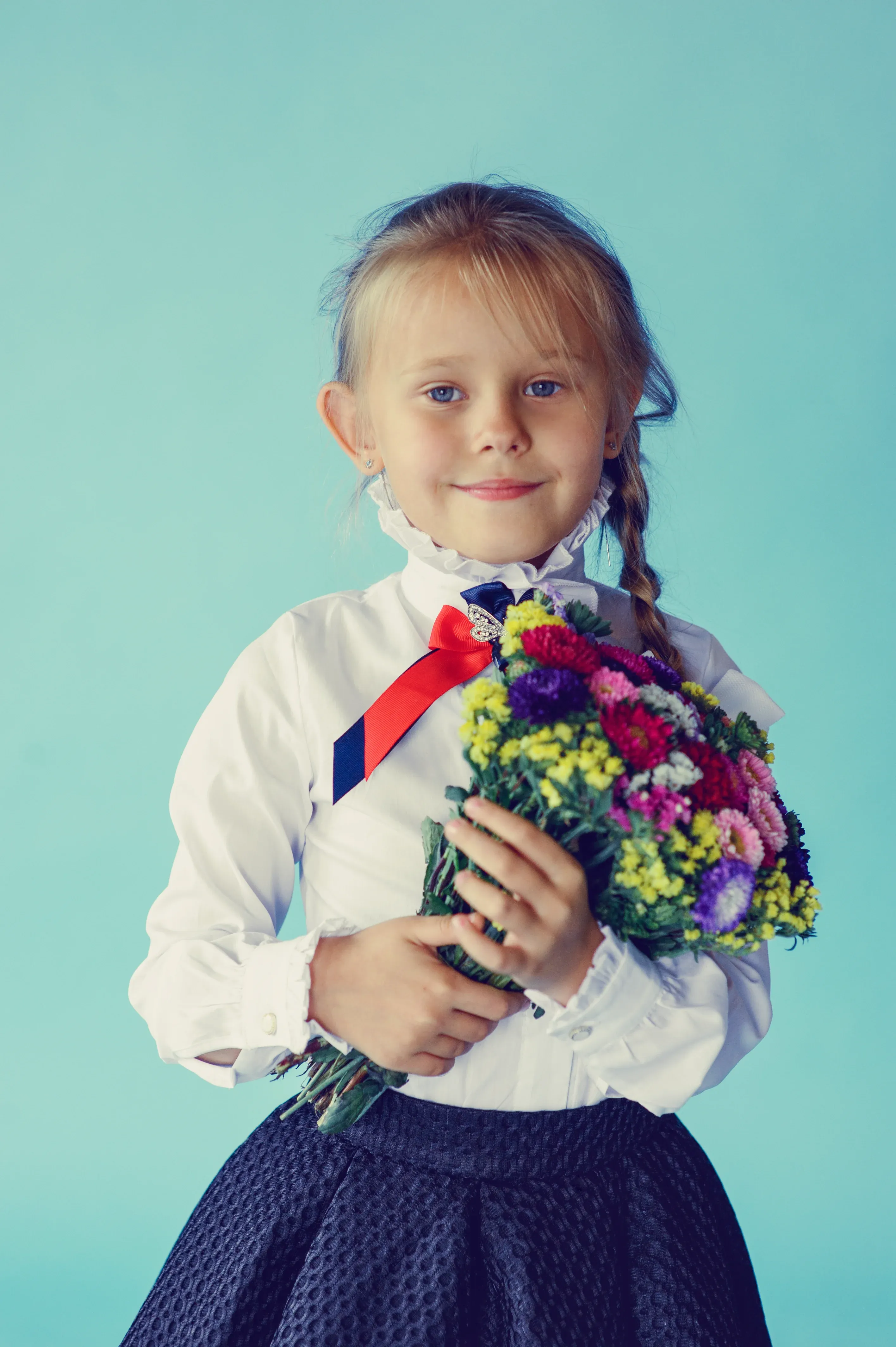 - Что касается цветовой палитры всего букета, то тут все зависит от возраста учителя. Если учительница относительно молодая, то ей больше подойдут светлые тона: белый, желтый, голубой, сиреневый, розовый, алый и кремовый. Если же учительница находится в более зрелом возрасте, то и цвет самого букета должен быть соответствующий: синий, зеленый, красный и фиолетовый. Исключением могут быть случаи, когда вы заранее знаете предпочтения учителя, которому будете дарить букет на первый звонок.